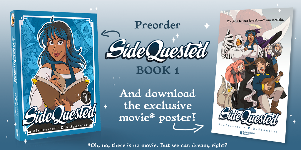 If you’ve already preordered the first book, Andrews McMeel Universal, our wonderful Publisher, has a digital reward for you! A high-resolution Movie Poster of Side Quested is available here! Just enter your name and email and the download will be sent directly to your account.