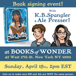 We have nothing specific planned, but we’ll have met each other in person for the very first time about an hour before the event so it will certainly be weird! We’ll also be there to sign books! If you can’t be there, but would love to have your own signed copy, you can preorder it at the Books of Wonder website. And we are working to make signed bookplates available for readers who already have a copy of SIDEQUESTED and want a little extra bookbling.